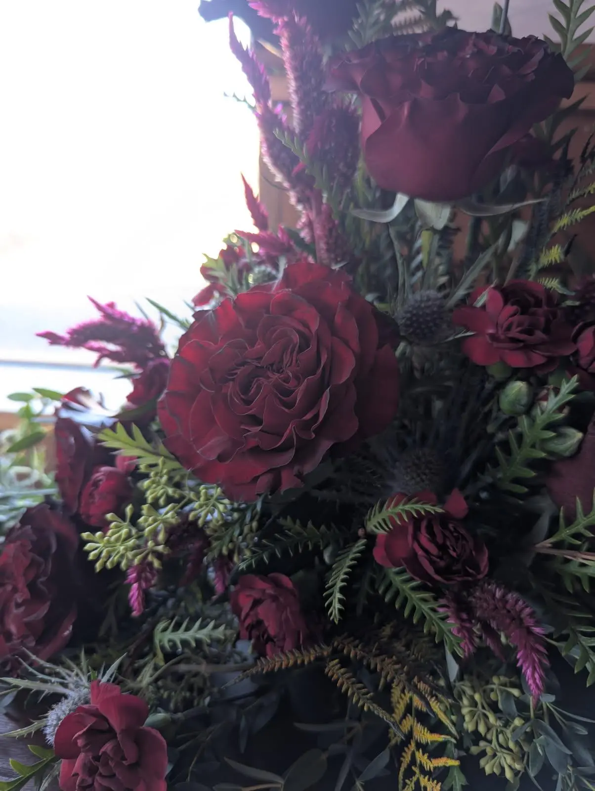 A beautiful, big, arrangement--full of textures, and peaceful colors. This collection of delicate, yet long-lasting flowers, is perfect for anyone.